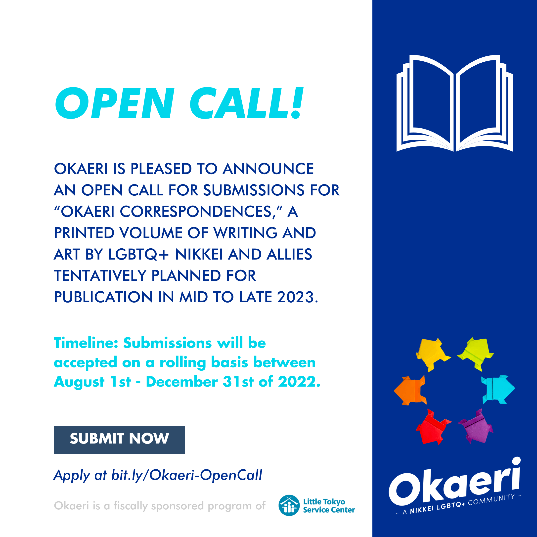 Okaeri is pleased to announce an open call for submissions for “Okaeri Correspondences” (working title), a printed volume of writing and art by LGBTQ+ Japanese/Japanese Americans and allies tentatively planned for publication in mid to late 2023. We invite writers and artists of all experience levels to reflect critically and honestly about the phrase Okaeri, which in Japanese means “welcome home” or “welcome back.” What does Okaeri look like in contemporary life? How does the meaning of Okaeri connect across the past, present, and future? How do your Japanese/Japanese American / LGBTQ+ / ally experiences inform your reflections? Contributors are encouraged to explore topics that are directly relevant to their experiences, including both the struggles and successes of finding community.