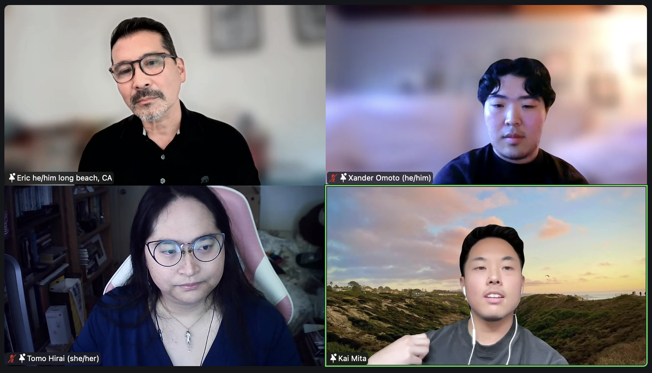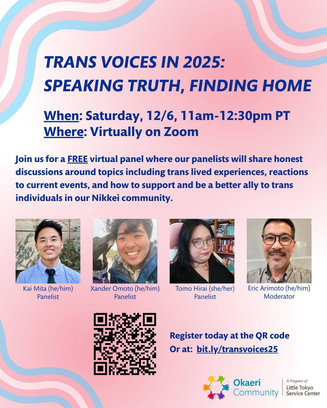 On Saturday, December 6th, we convened a wonderful panel on the trans Nikkei experience featuring Kai Mita, Xander Omoto, and Tomo Hirai, in conversation with Eric Arimoto. Each of the panelists shared viewpoints on only on their individual journeys, but also on points such as what makes a good ally, what causes harm and discomfort, finding community through Okaeri, and how their gender identities and expressions have and continue to impact their lived realities.
